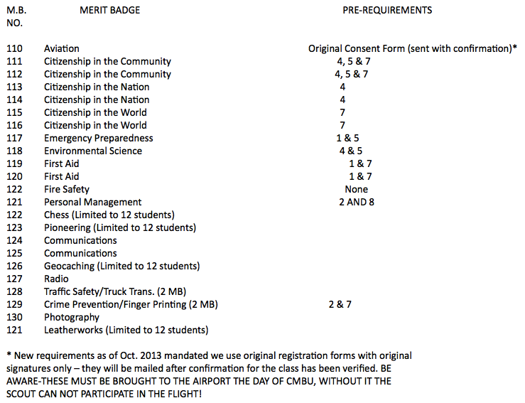 The following is a list of merit badges the will be offered their code and pre-requirements. Also here is a link I found with downloadable MB Book’s http://troop577wichita.weebly.com/merit-badge-pamphlets.html